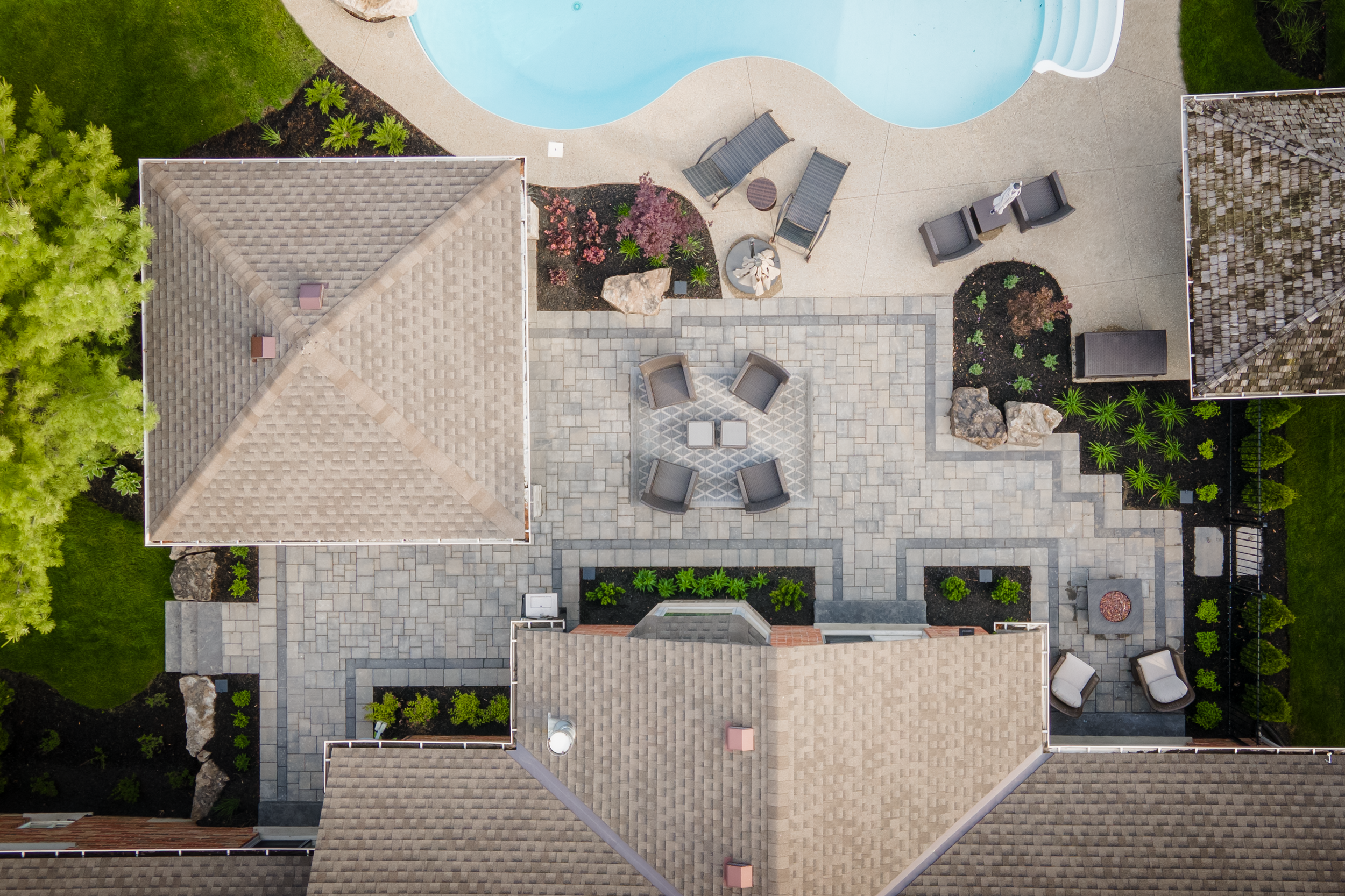 A new patio layout with complementary garden shapes seamlessly tie this backyard renovation to the existing pool and pool shed/bar structure.